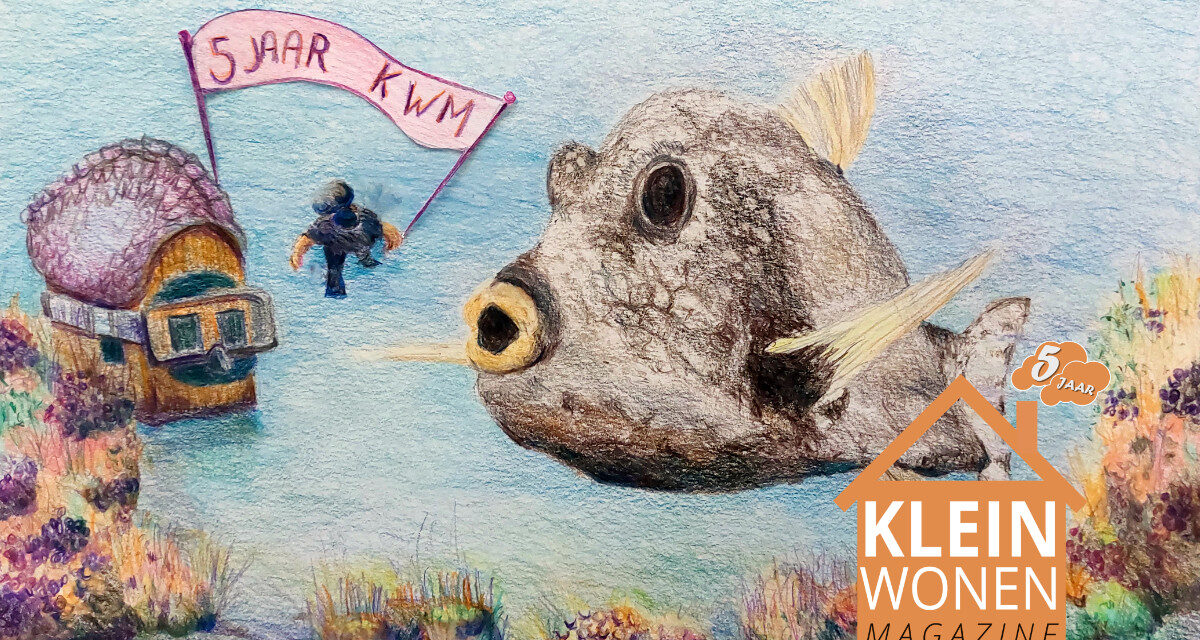 Bouwkundig ingenieur Marcel van Mierlo schrijft al jaren over kleine bouwsels en tekent er graag zelf zijn illustraties bij. In samenwerking met Tiny Publisher/Klein Wonen Magazine bracht hij al drie vrolijke digitale boekjes uit over het olijke tiny house op wielen Finny en zijn vriend Bob. De laatste avonturen beleefde het tweetal in de Caraïben. Zij vieren het lustrumjubileum van Klein Wonen Magazine graag mee door ons te feliciteren met een spandoek op de covertekening en een mooie prijsvraag.